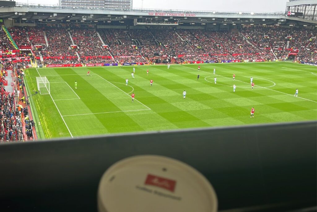 The suite’s windows overlooked the East Stand forecourt, offering a unique perspective of the fans gathering below. When it was time for kick-off, we took our seats in the Directors’ padded armchairs at the front of the Northwest Quadrant. The view was AMAZING. Blankets and coffees were provided, adding a touch of comfort to the excitement. It truly embodied the essence of Manchester United hospitality services.